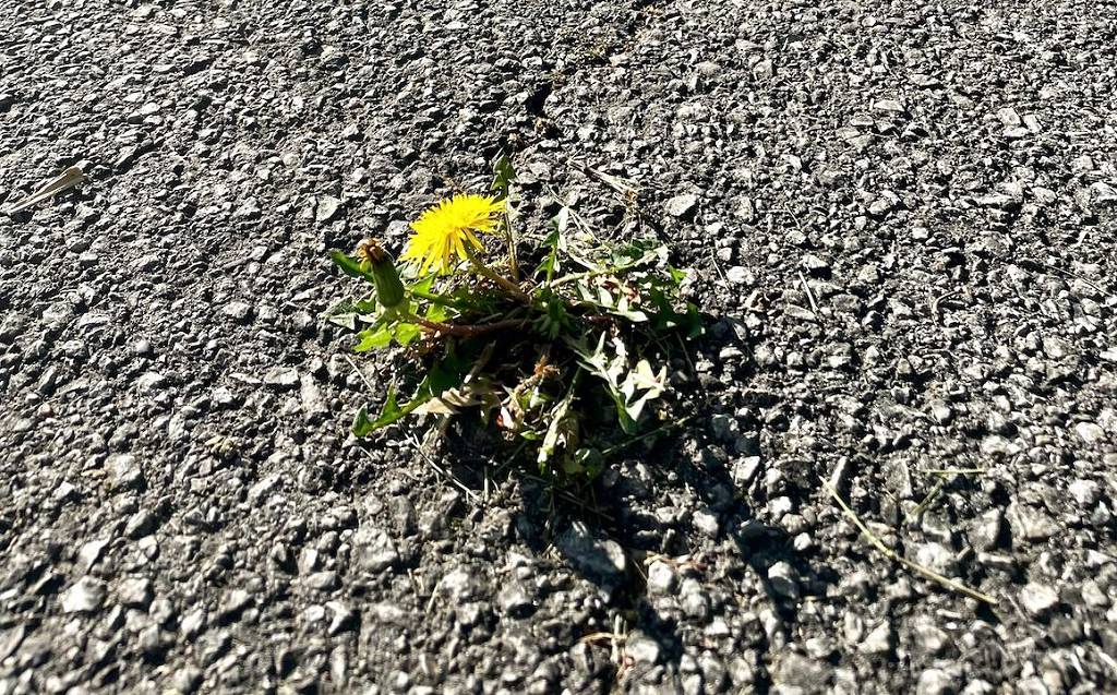 After the ice and snow finally melted off our driveway this February — after the terrible winter storm — we noticed a new crack in the asphalt. Today, I noticed the most adorable dandelion poking its little lion mane up through that crack. Dandelions are a meditation in resilience.